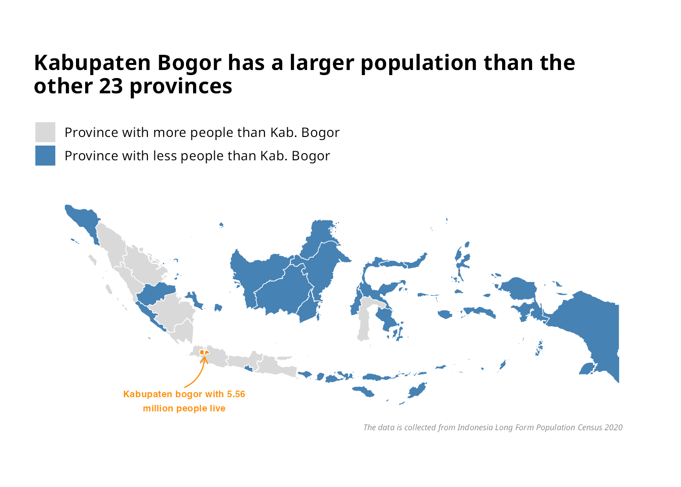 And boy, was I wrong about Jakarta! It turns out Kabupaten Bogor comes out as Indonesia’s most populous regency, with a staggering 5.56 million people. And what even more shocking is this 2,992 km² area is more populous than 23 of Indonesia’s provinces! You can see below which of those provinces have less population than Kabupaten Bogor.